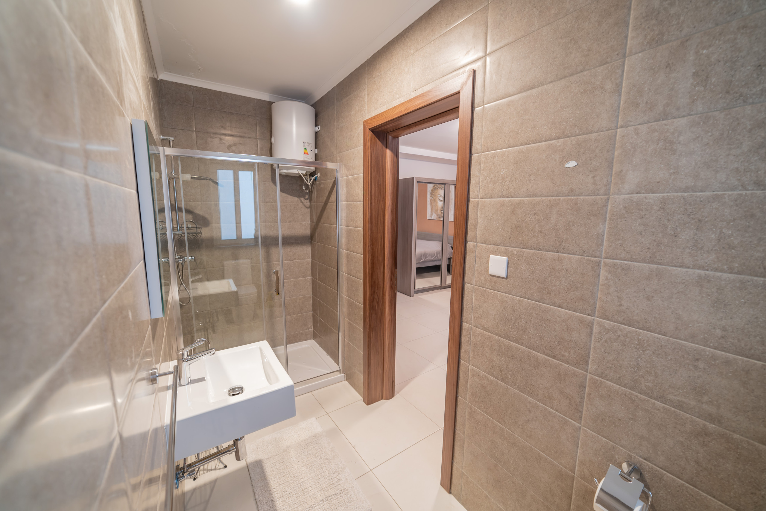 El dormitorio principal cuenta con una cómoda cama doble, abundante espacio de almacenamiento y un elegante baño en suite con una ducha moderna de estilo walk-in. Un aseo de invitados separado añade mayor comodidad durante su estancia.