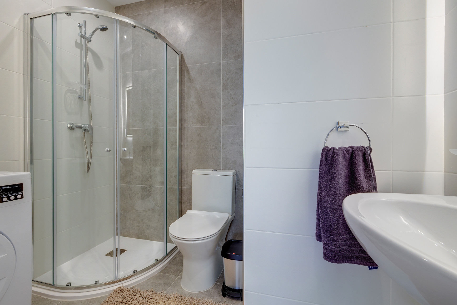 El baño principal es moderno y funcional, con una ducha amplia y toallas frescas