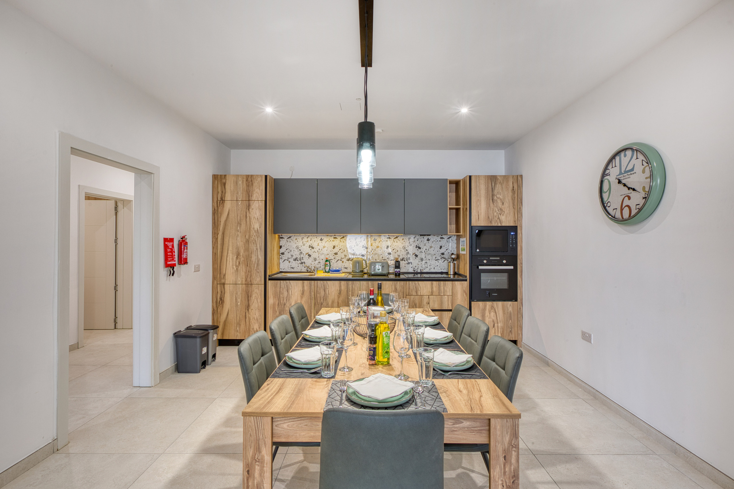 En entrant dans la propriété, on trouvera la grande et lumineuse cuisine/salle à manger ouverte. La cuisine est moderne et entièrement équipée, comprenant une machine à café, une bouilloire, un grille-pain et tous les ustensiles de cuisine et la vaisselle nécessaires. Elle dispose d'une très grande table à manger et d'un agréable coin salon. L'espace ouvert donne sur un grand balcon avec un ensemble de salle à manger et une vue mer impressionnante.