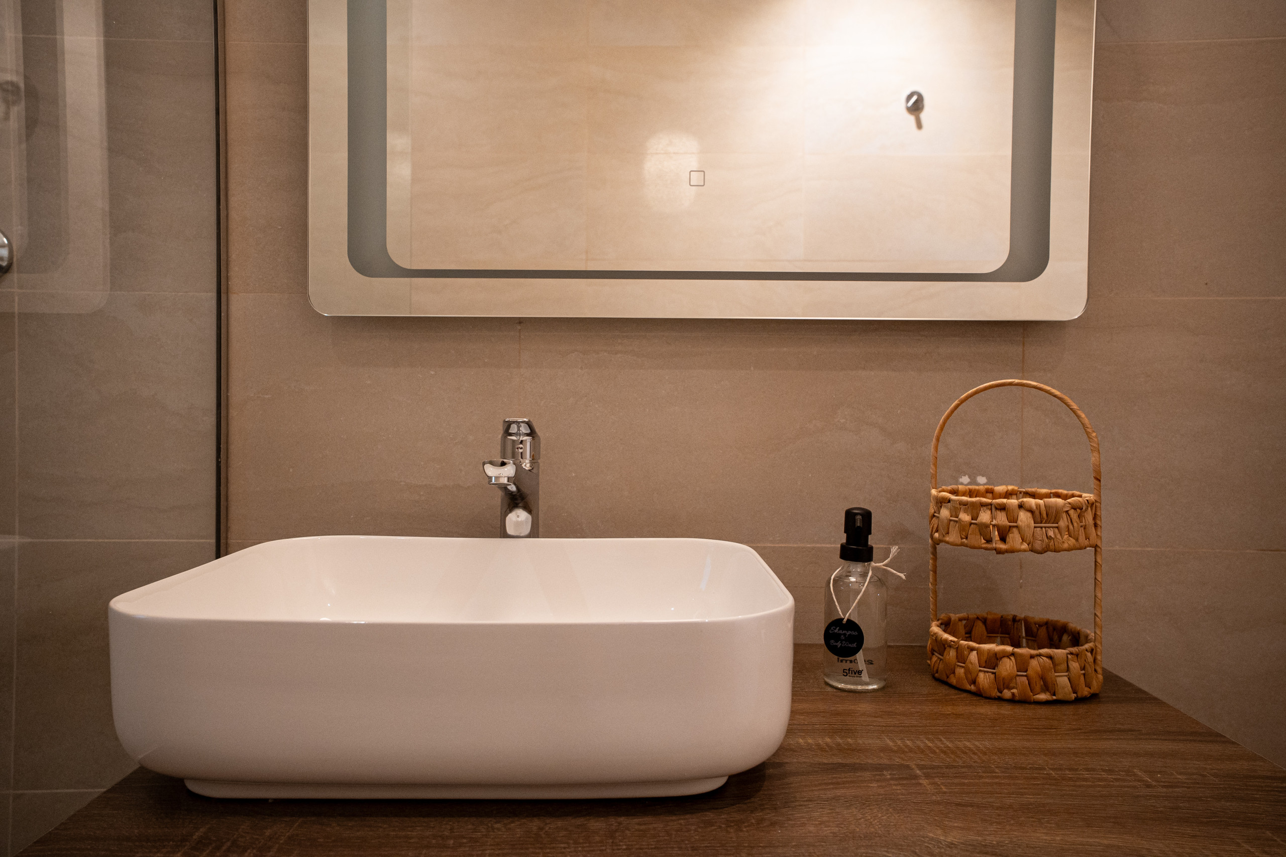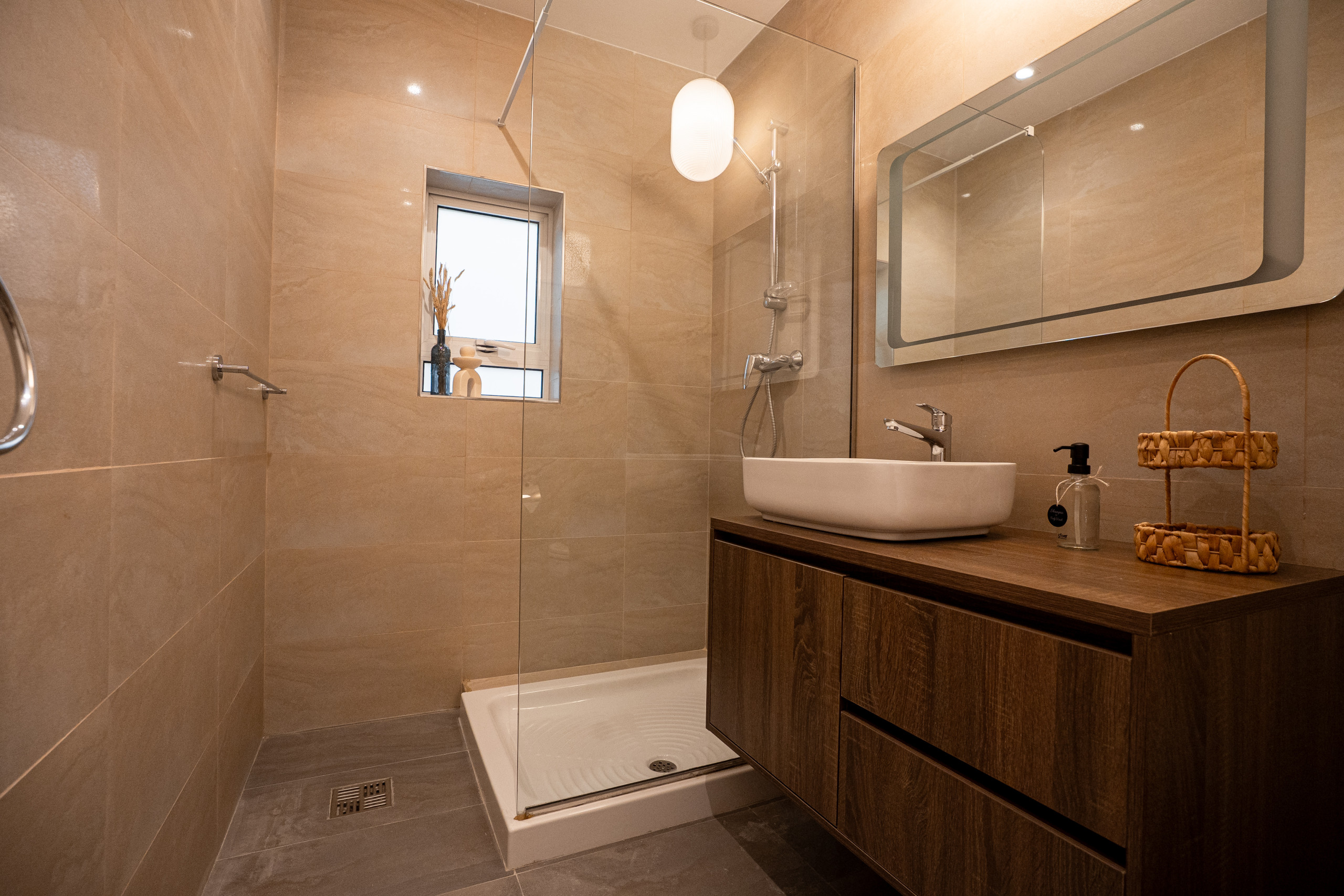 La grande salle de bain comprend à la fois une baignoire de taille standard et une douche séparée, offrant un confort supplémentaire pour les séjours plus longs.