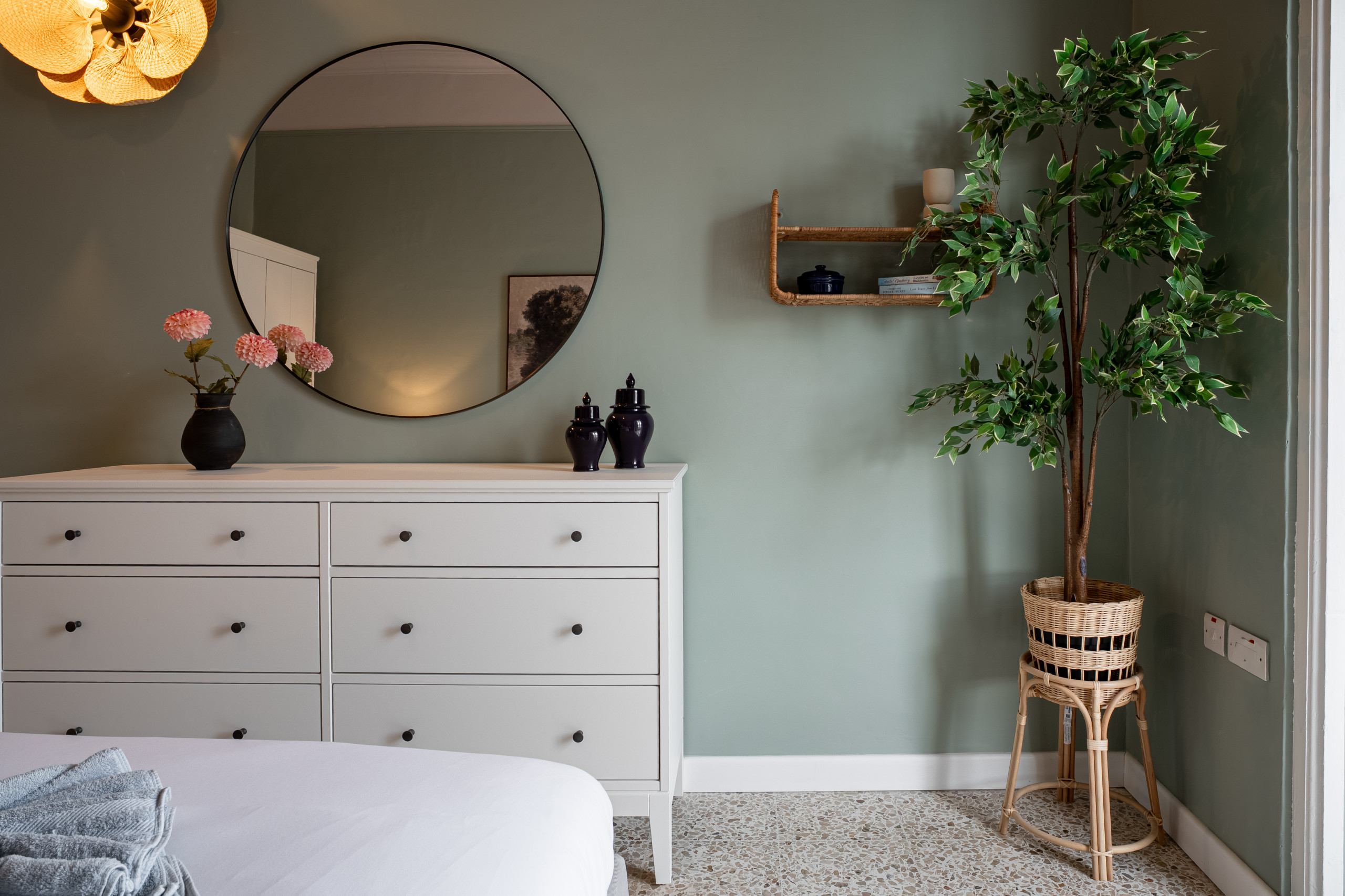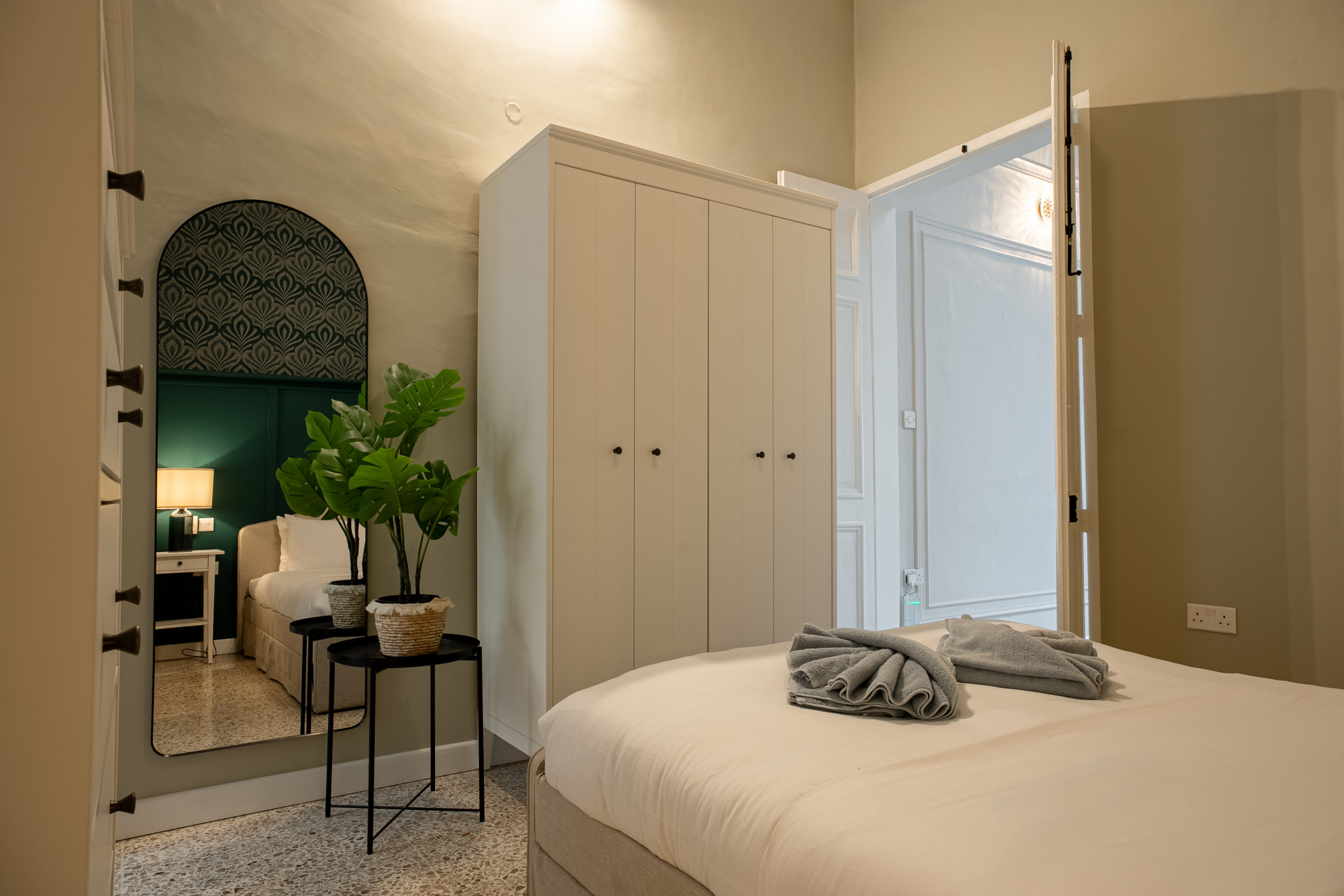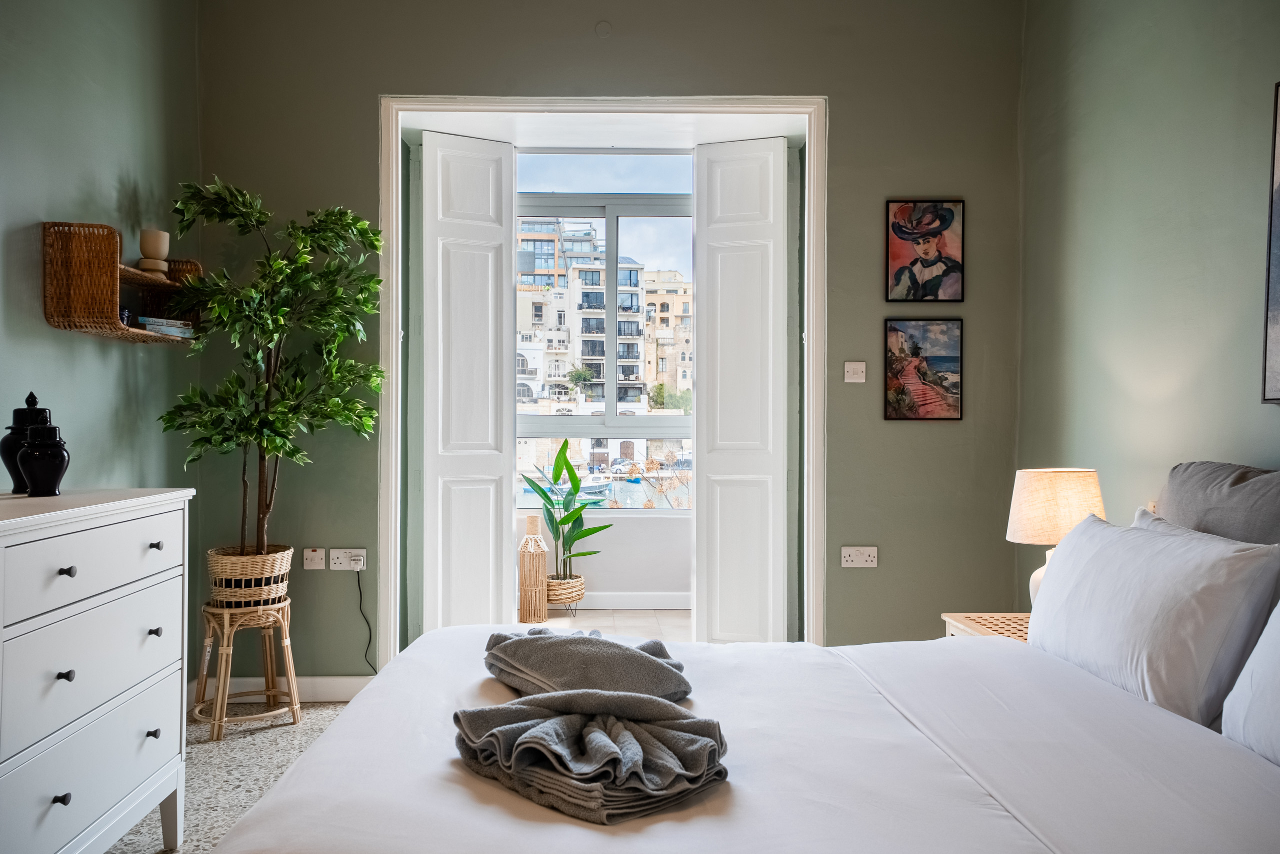 Chambre Principale : Lumineuse, spacieuse, magnifiquement décorée et baignée de lumière naturelle, cette chambre donne sur un balcon traditionnel maltais surplombant la baie de Spinola — l'endroit idéal pour savourer votre café du matin tout en observant le port qui s'anime.