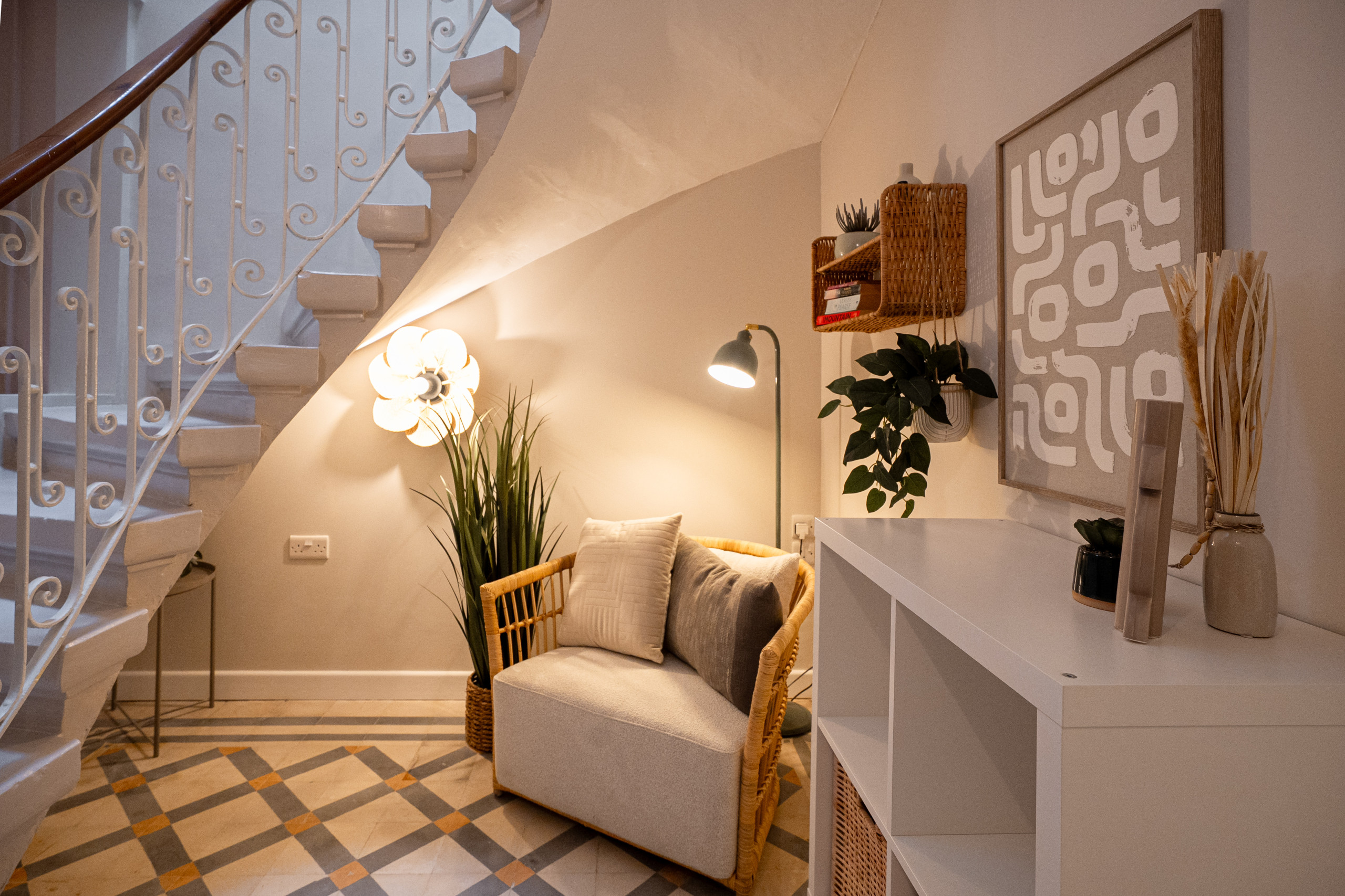 Entrez et ressentez immédiatement comme chez vous. Le rez-de-chaussée s'ouvre sur un magnifique espace de vie décoré de carreaux maltais originaux, mettant en valeur l'artisanat et le patrimoine de l'île. L'espace est soigneusement conçu pour la détente, avec un canapé-lit double confortable, idéal pour les invités supplémentaires ou les soirées paresseuses à l'intérieur. Un escalier traditionnel saisissant ajoute une élégance architecturale et vous conduit aux étages supérieurs.