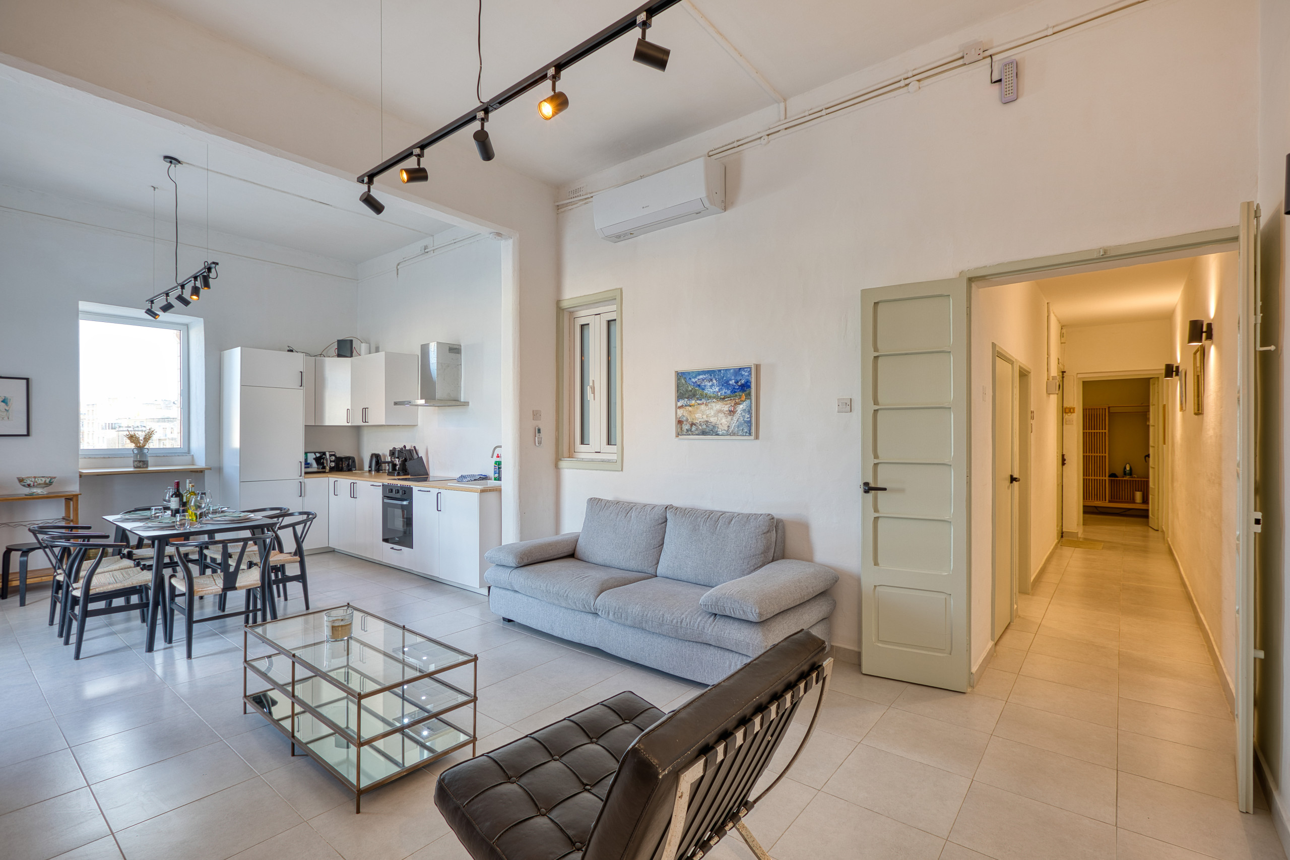 The apartment has been thoughtfully styled to combine modern elegance with comfort. The open-plan layout seamlessly brings together the living, dining, and kitchen areas, creating a welcoming social space ideal for couples, friends, or families.