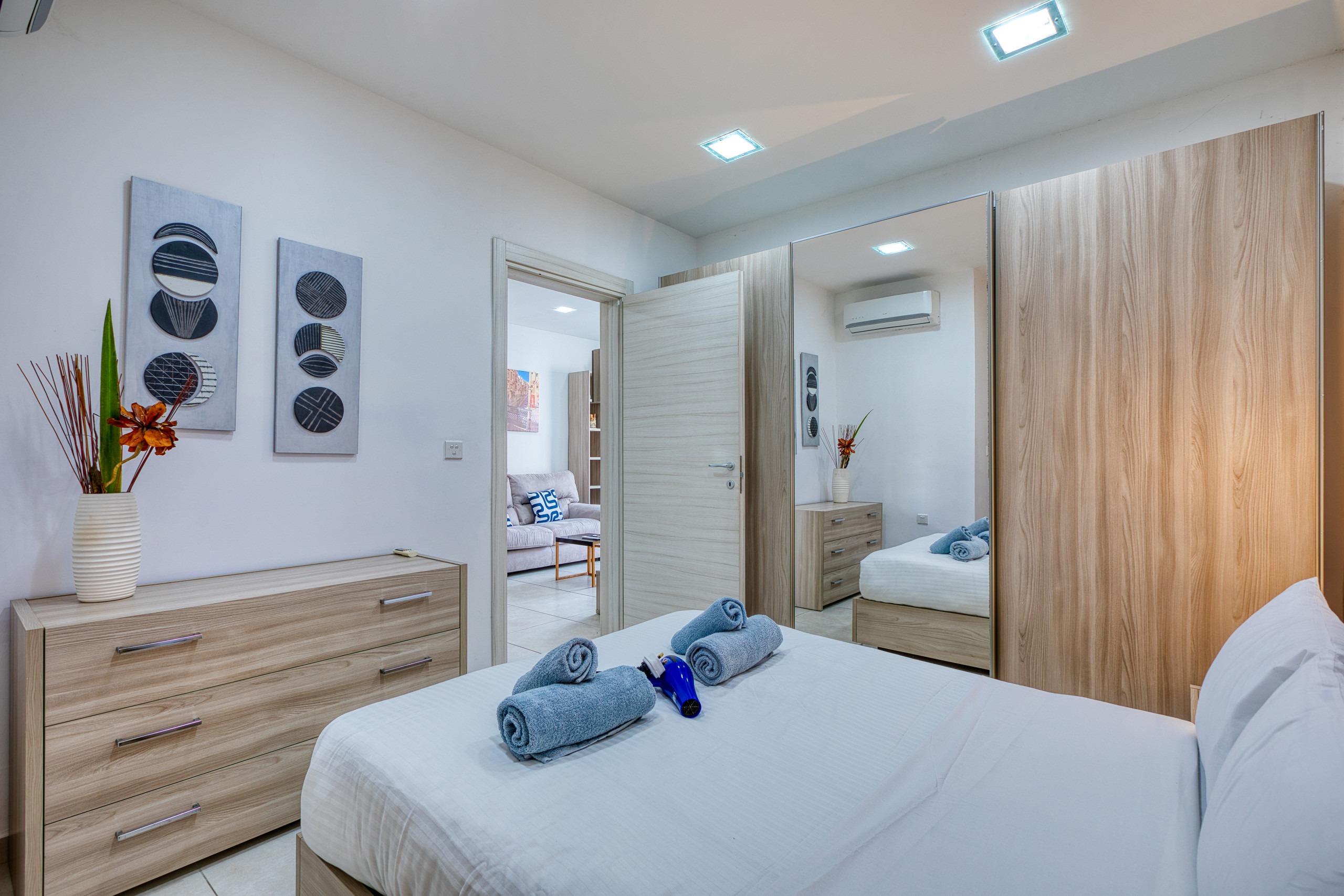 The apartment features two double bedrooms, thoughtfully furnished to ensure a restful stay. Crisp linens, ample storage, and full air conditioning throughout make the apartment comfortable year-round.