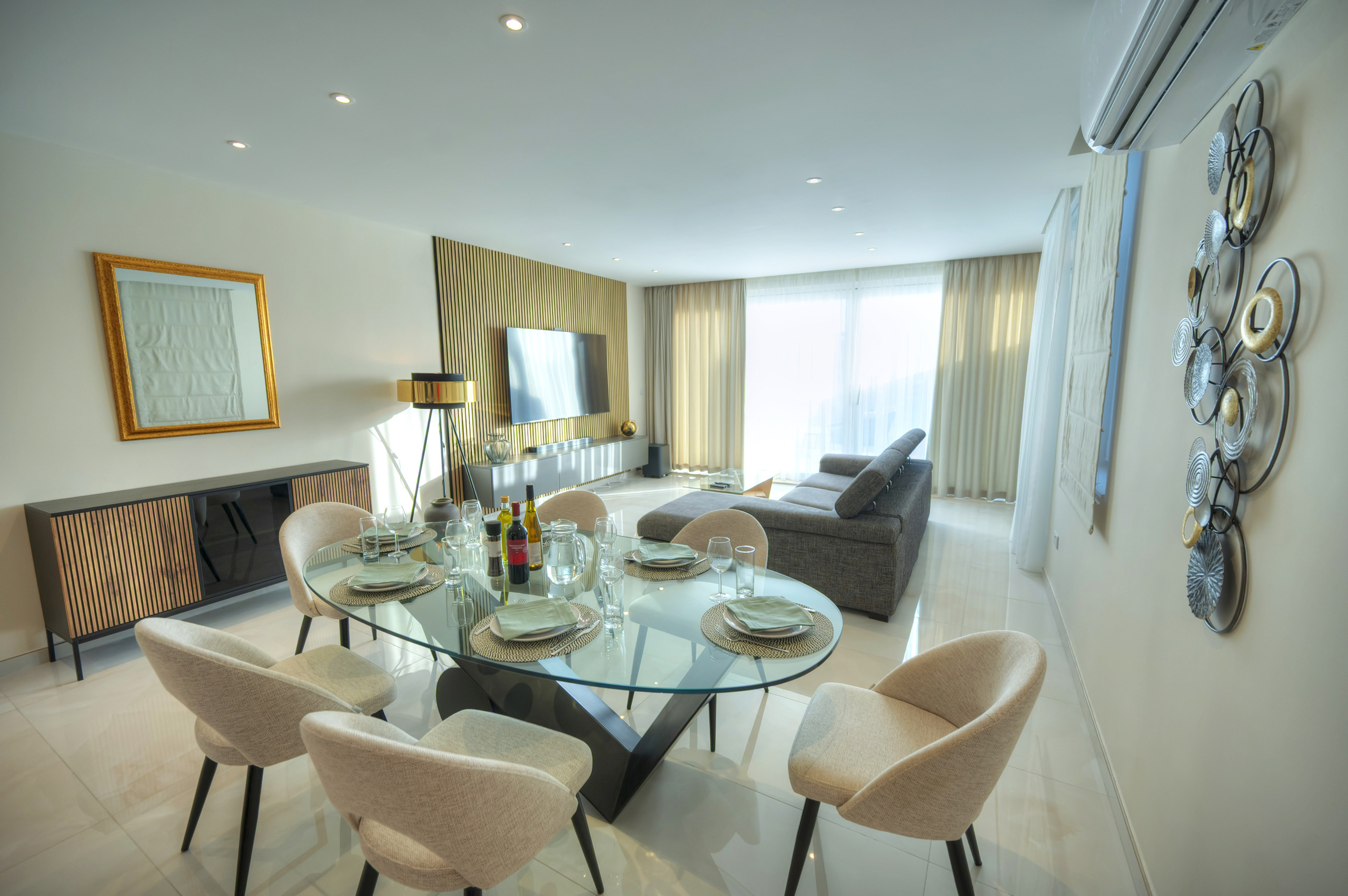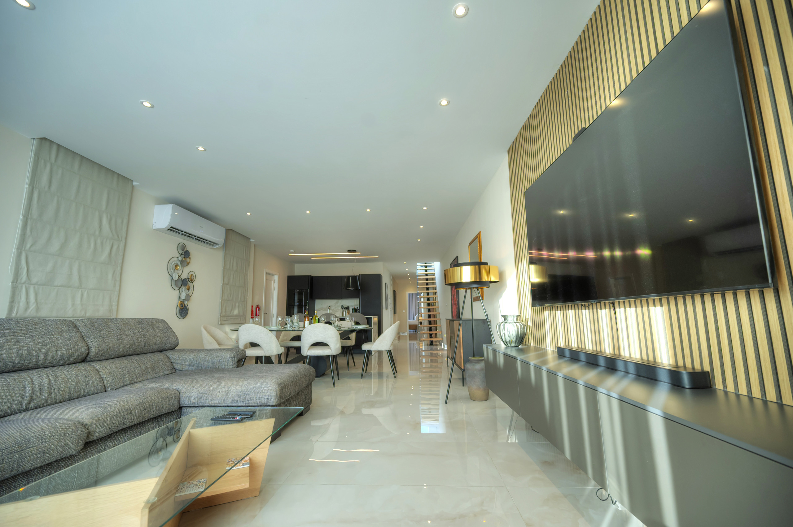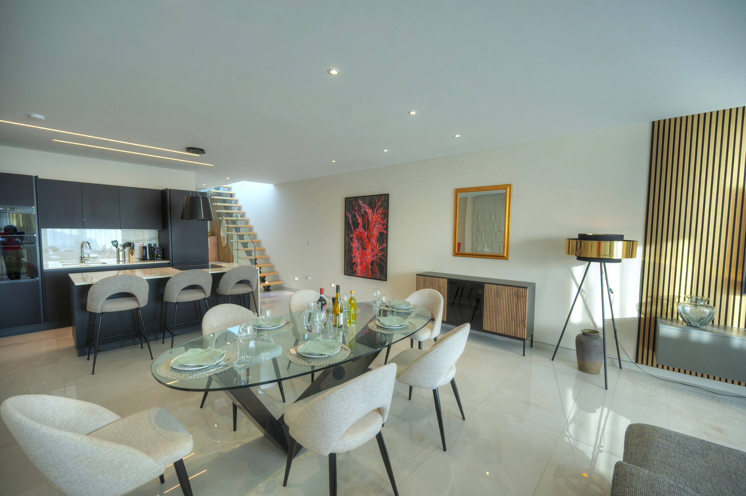 A large open-plan living and dining area, bright, stylish, and designed for relaxation or entertaining