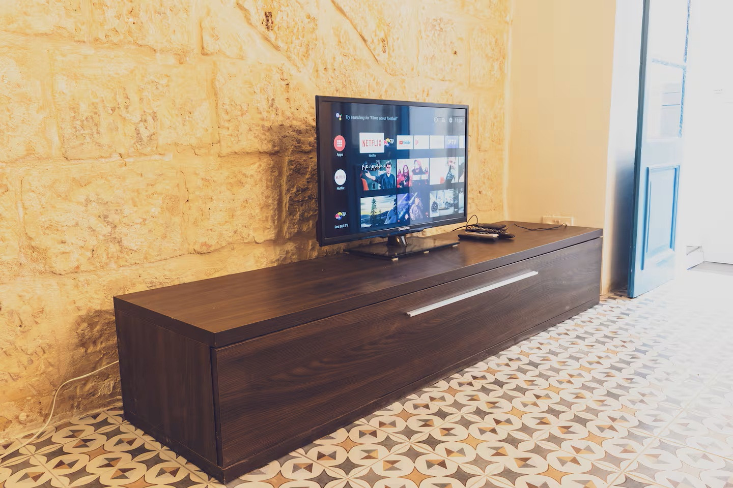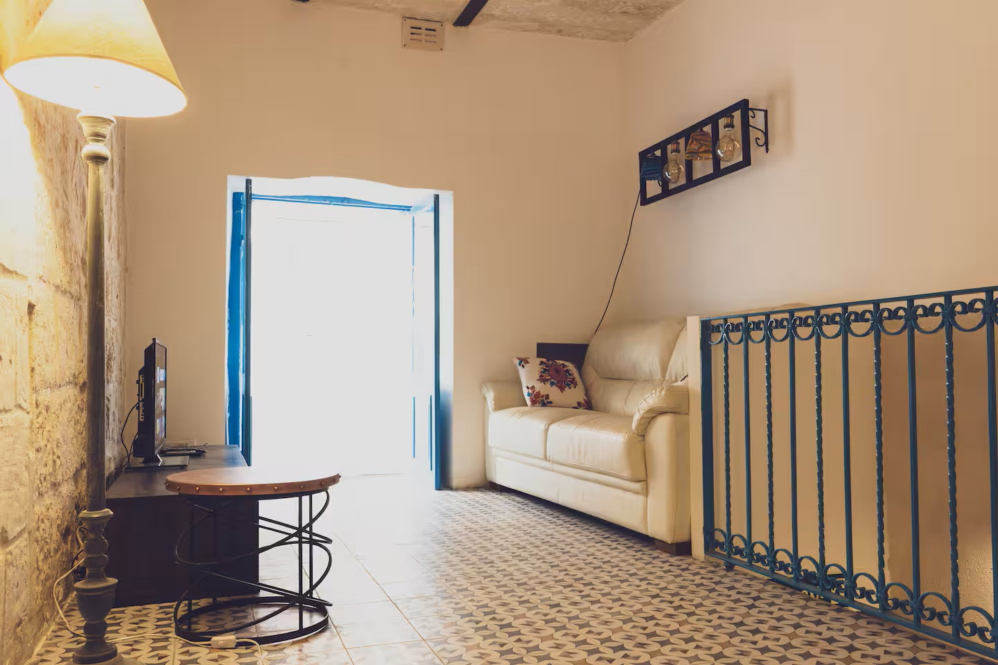 Living Area: A welcoming lounge with a sofa, flat-screen TV, and a traditional Maltese wooden balcony where you can relax and watch daily life unfold on the streets below.